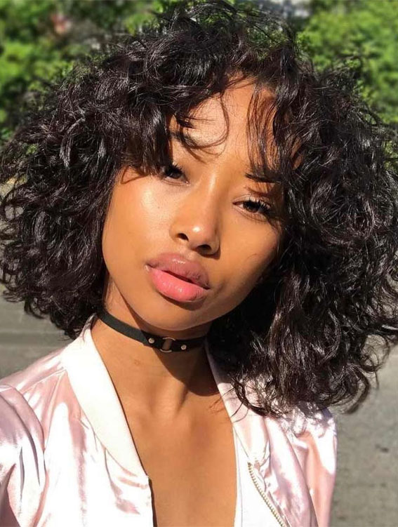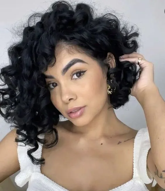 - With bangs: Curly shag, layered cut with fringe