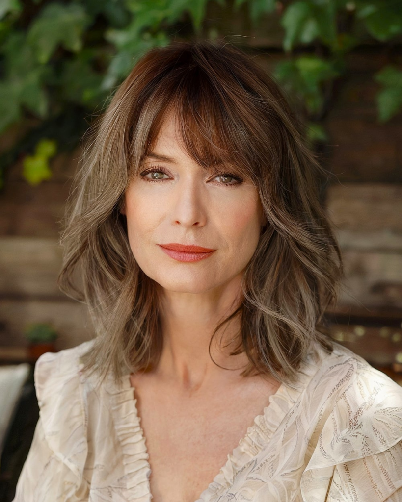 Why it works: This version pairs curtain bangs with layers that start at the cheekbones and continue down. The combination frames your face from forehead to chin. The layers add movement and volume, which is especially helpful if your hair has lost some of its former density.
