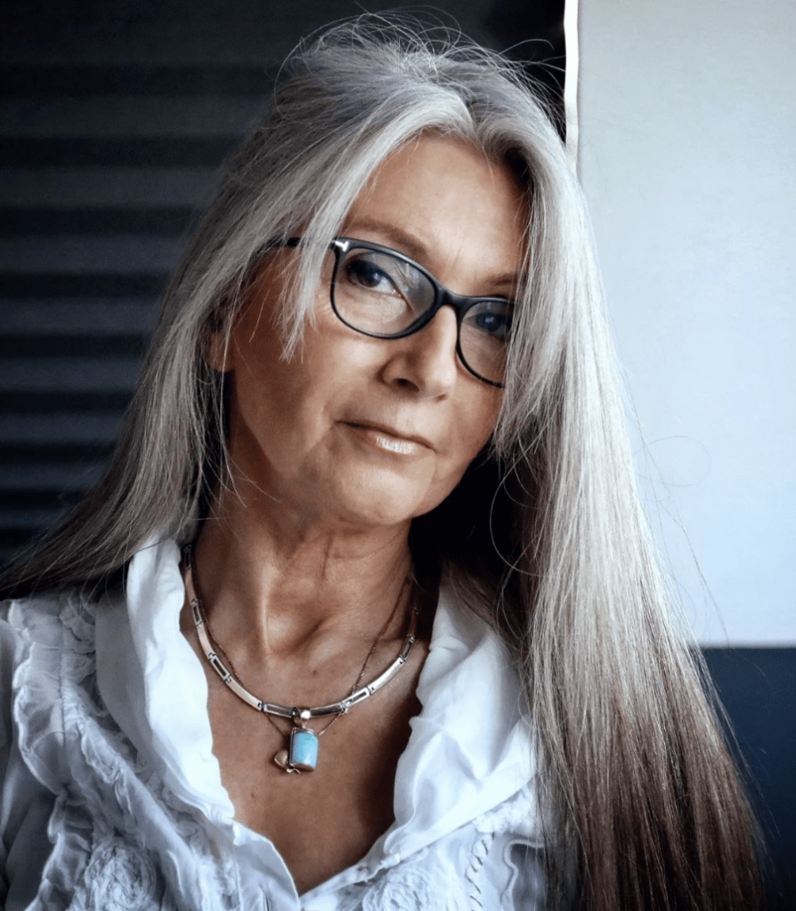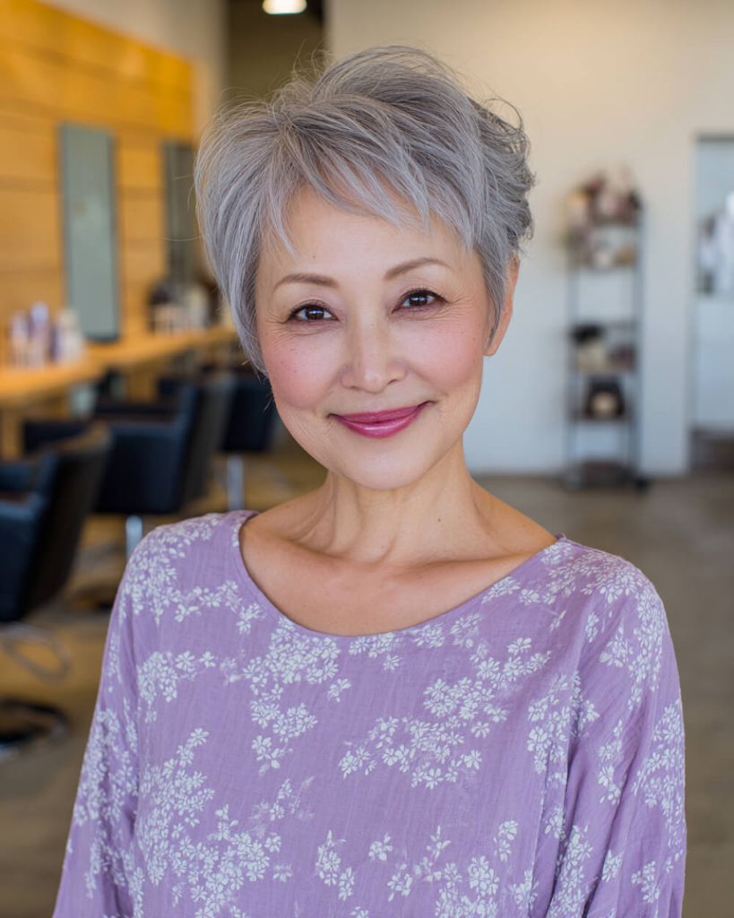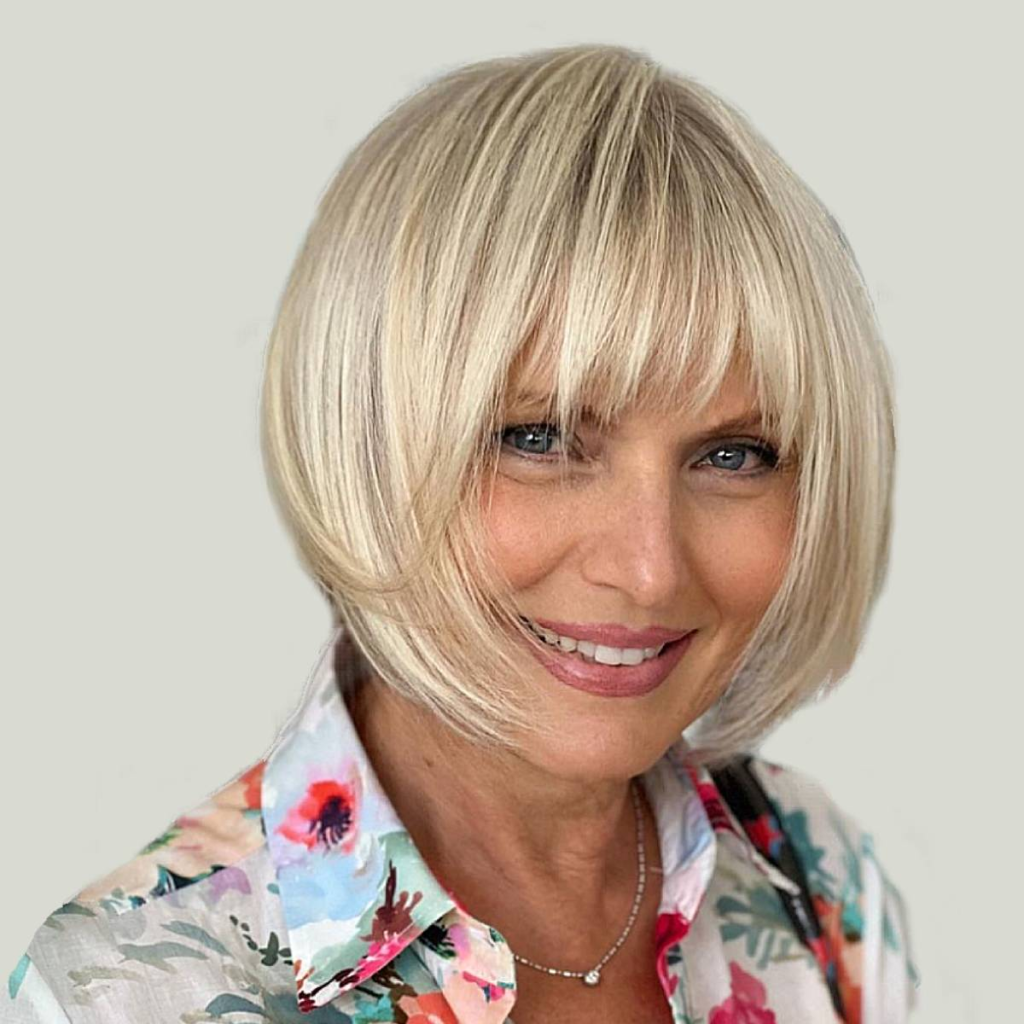 How to style: Apply a purple shampoo once a week to keep silver bright and prevent brassiness. Use a moisturizing conditioner because gray hair tends to be drier. Style the bangs as usual with a round brush. A shine spray enhances the silver tones.