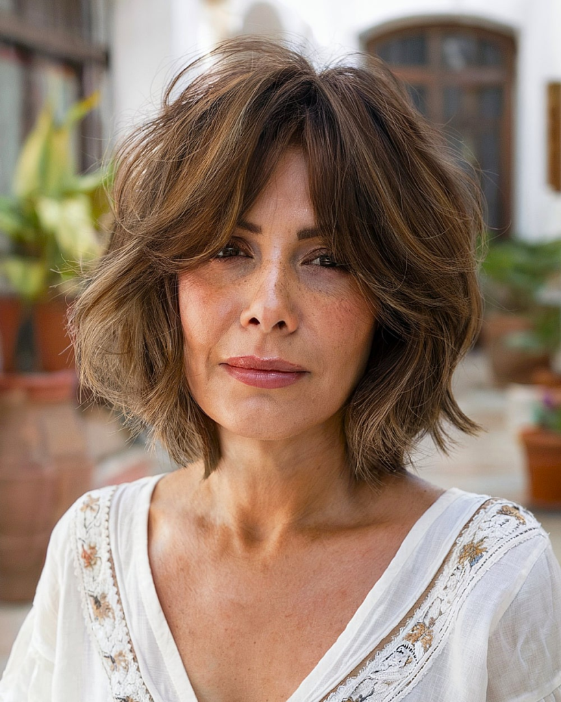 Why it works: Curtain bangs paired with a mid-length cut — think collarbone to shoulder — create a cohesive, polished look. The bangs blend into the layers throughout the cut, so nothing looks突兀 or disconnected. This combination is particularly flattering for women over 50 with fine or medium hair.