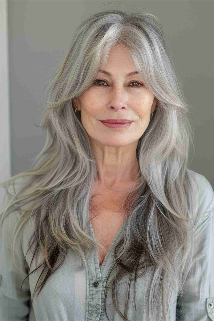 Why it works: Gray and silver hair have a different texture than pigmented hair — often coarser, sometimes drier, but always beautiful. Curtain bangs on gray hair catch the light differently than the rest of your hair, creating natural highlights and dimension. The bangs also soften the contrast between your hair and your face.