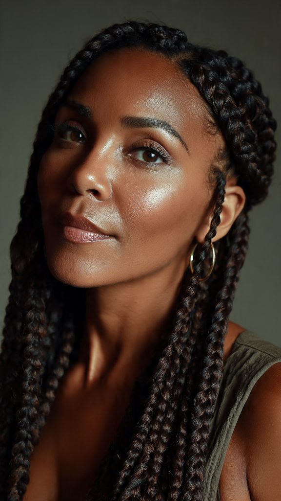 Box braids remain a classic protective style, and when worn long with clean parting, they feel mature, elegant, and intentional. This style is low-maintenance and ideal for busy lifestyles.