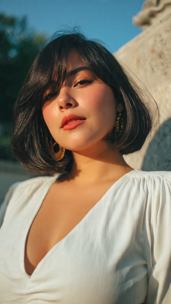 An angled bob is a classic slimming hairstyle for round faces. The shorter back lifts the overall shape, while longer front pieces create vertical lines that draw the eye downward.