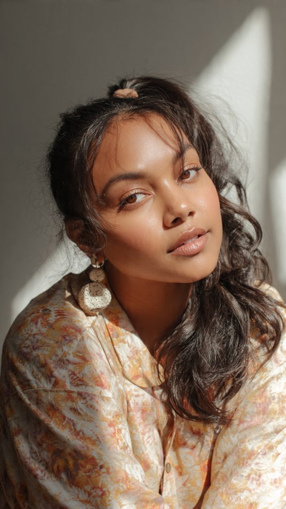 A high ponytail can surprisingly slim a round face when styled correctly. The lifted crown adds height, while loose face-framing pieces soften the cheeks.