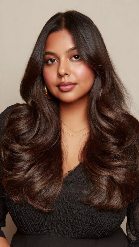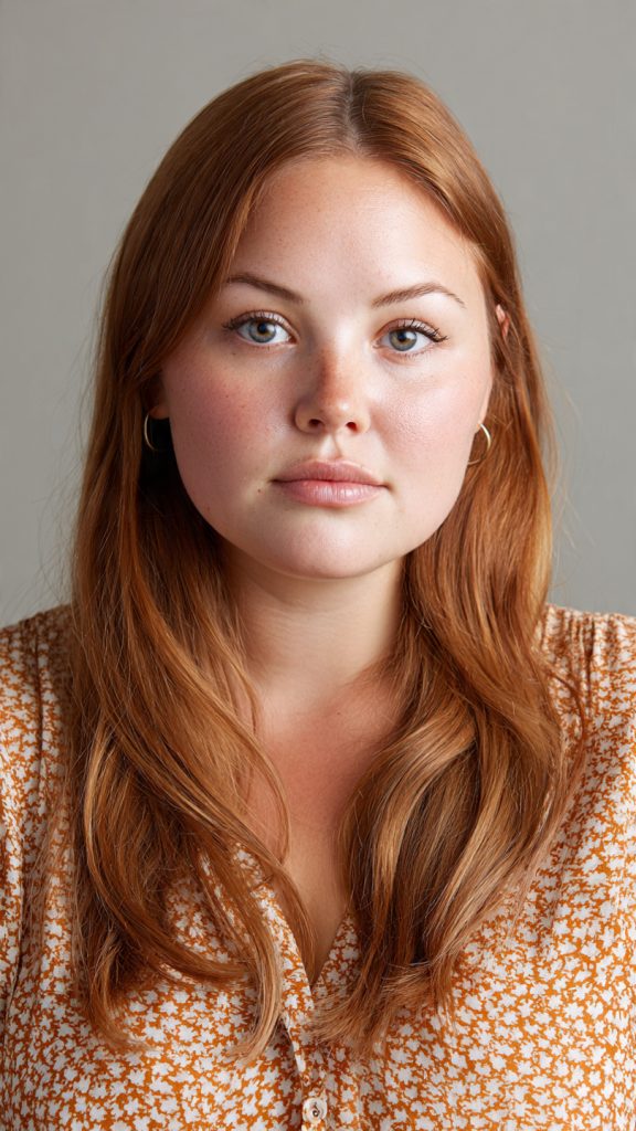 Long hair can be extremely flattering on a round face when cut correctly. Face-framing layers that start below the chin help elongate the face and reduce the appearance of cheek fullness. Adding subtle volume at the crown further enhances the slimming effect.
