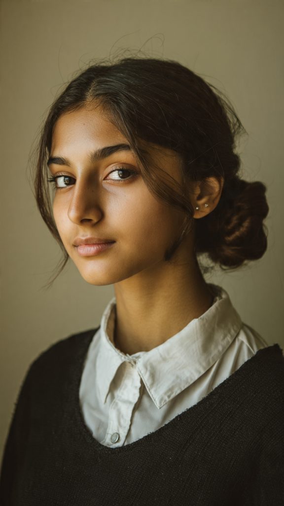 A low bun with a side part looks tidy and mature, making it great for school presentations or formal school events. It keeps hair secure while still looking stylish.