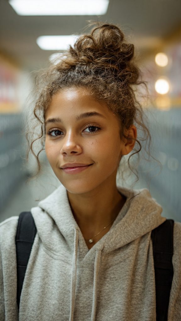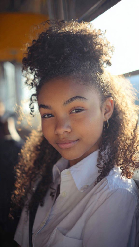 Embracing natural texture is always a great choice. A half-up puff highlights curls while keeping hair off the face, making it practical for school.