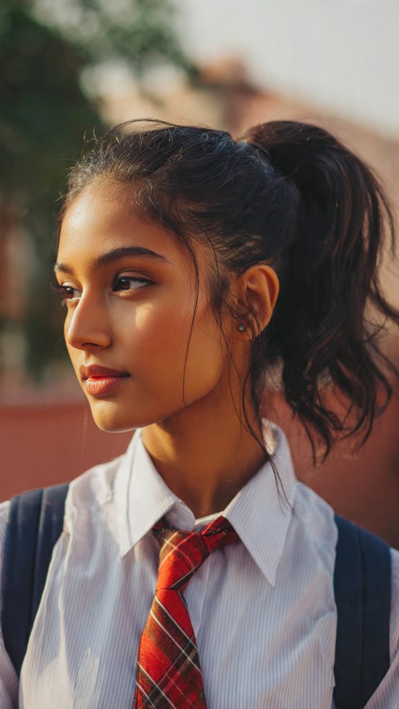 A high ponytail is one of the most timeless hairstyles for school. It’s quick to do, keeps hair off the face, and works for almost all hair lengths. Adding soft volume at the crown prevents the style from looking flat and gives it a polished finish.
