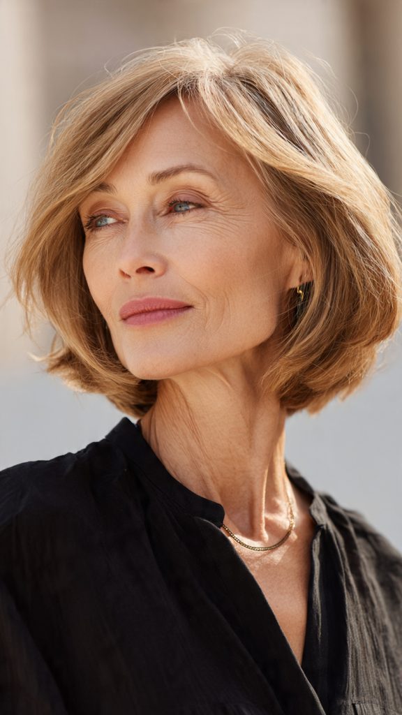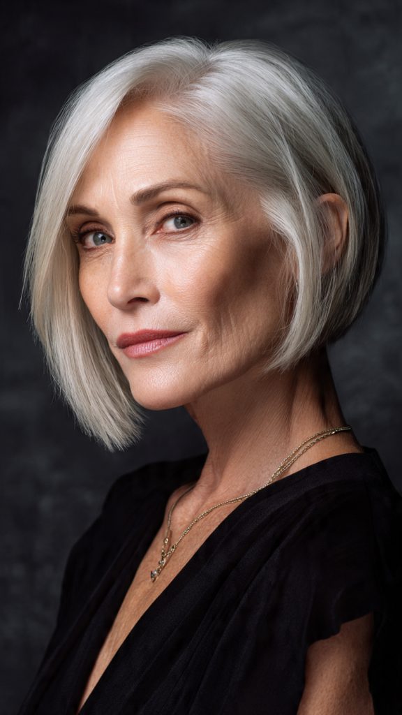 A classic bob with blunt ends creates a sophisticated silhouette. It’s low-maintenance yet stylish, perfect for older women who want a timeless look.