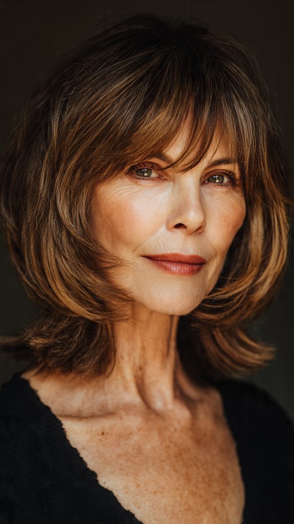 The layered bob is a go-to for women over 60. By adding layers, you can give fine hair more movement and texture. A side part softens facial features, creating a youthful, airy vibe.