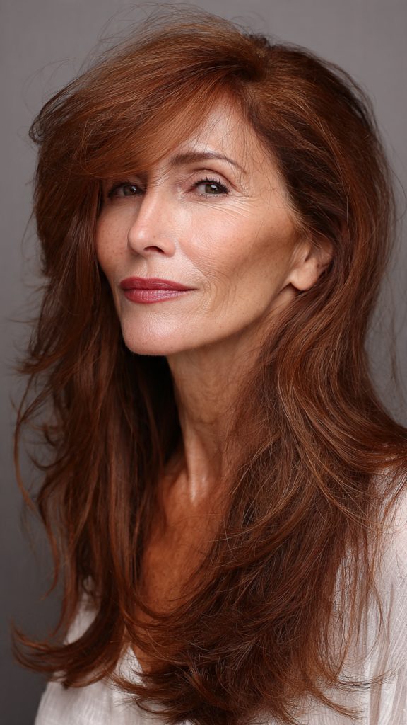 Long layers with a side-swept look are elegant and versatile. Perfect for fine hair, this style allows movement without looking flat. It works beautifully for women who enjoy styling their hair in soft updos or letting it flow naturally.