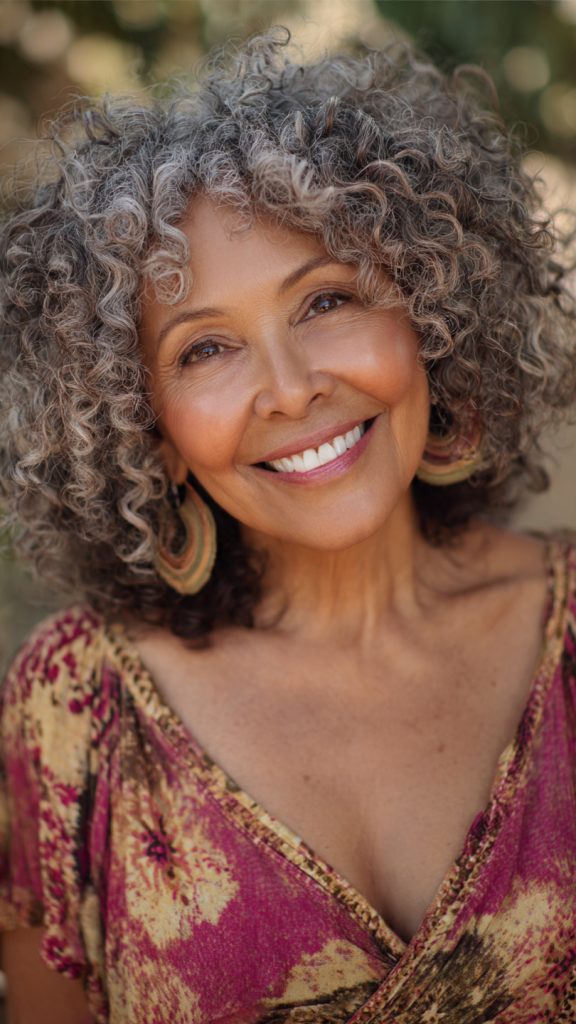 AI image generation description: “Joyful older woman over 60 with fine curly hair in voluminous medium-length curls, honey-brown highlights, soft natural makeup, sunny outdoor setting, diverse ethnicity representation.”