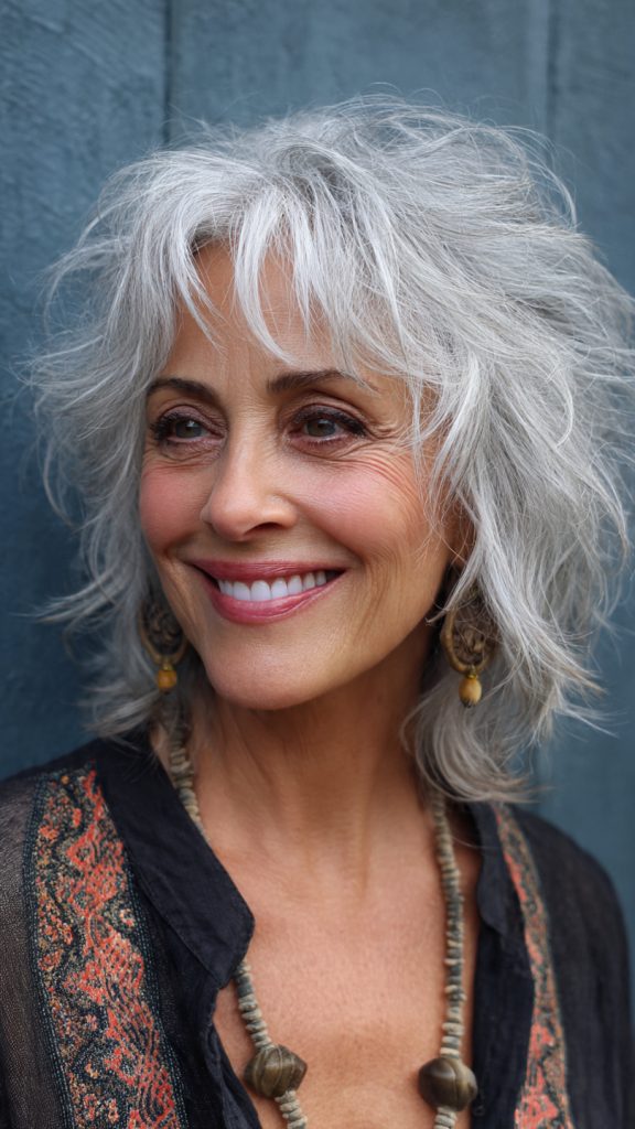 The shag haircut isn’t just for the young—it looks fantastic on women over 60 too! Short layers, choppy ends, and face-framing pieces give a playful, energetic look that makes fine hair appear fuller.
