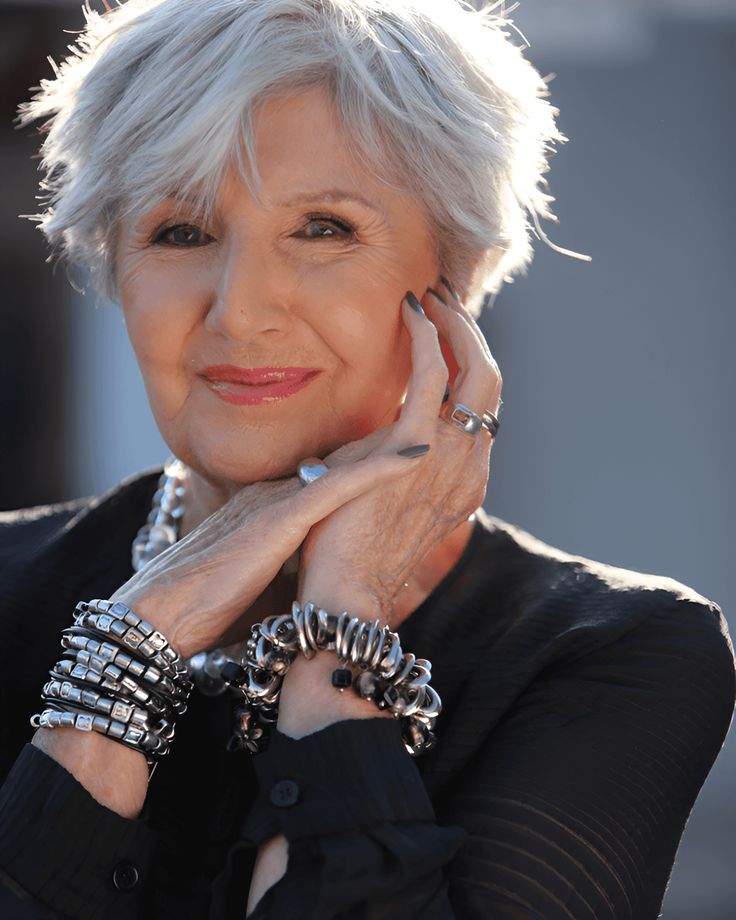 Why it works: Even shorter than a pixie, the textured crop is clipped very close at the back and sides with just a quarter to half an inch on top. It is the lowest maintenance cut possible. Silver or white hair looks striking at this length.