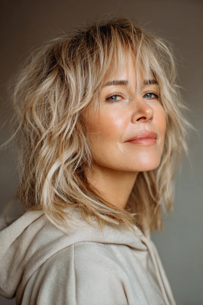 - Wavy: Short layered bob, wavy bob with curtain bangs, medium shag.