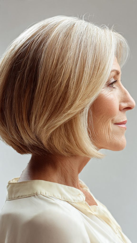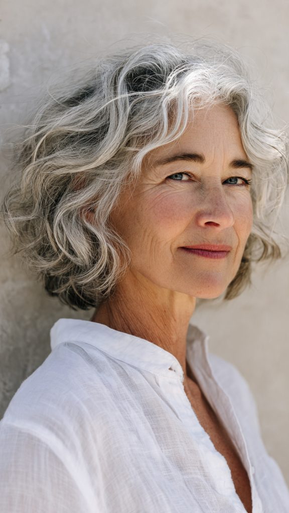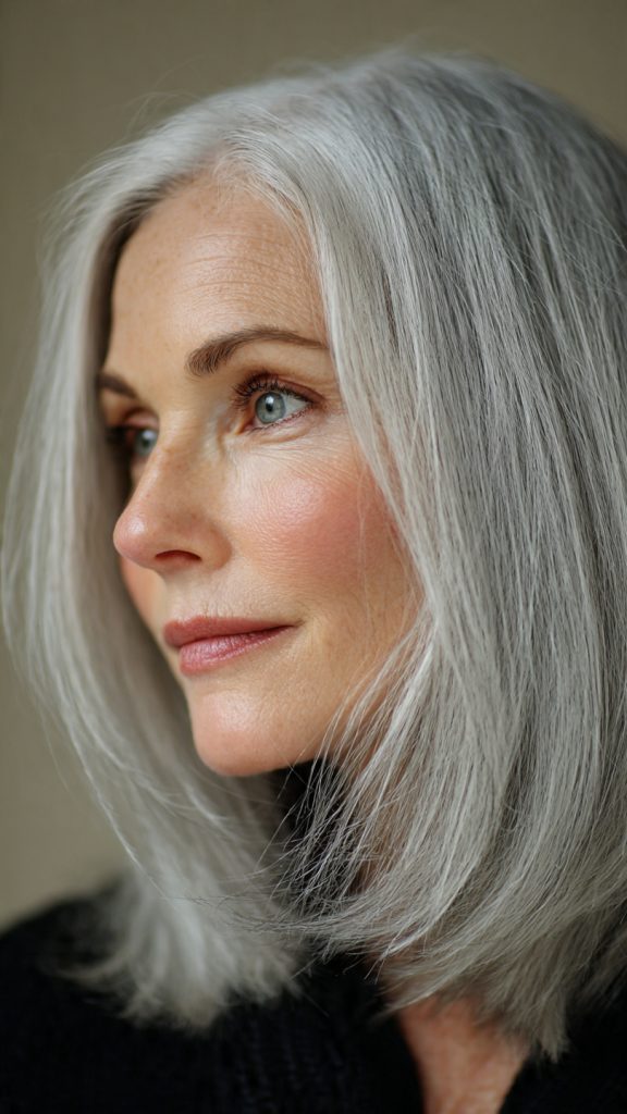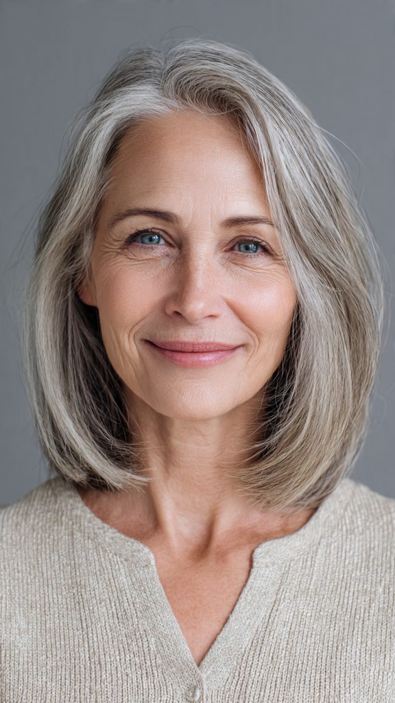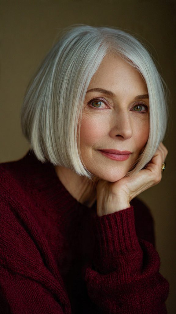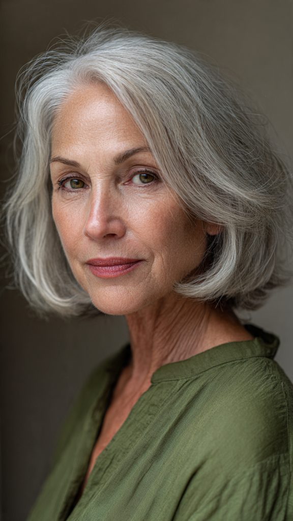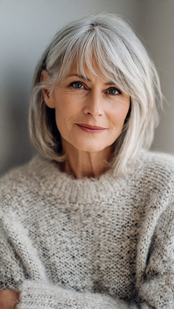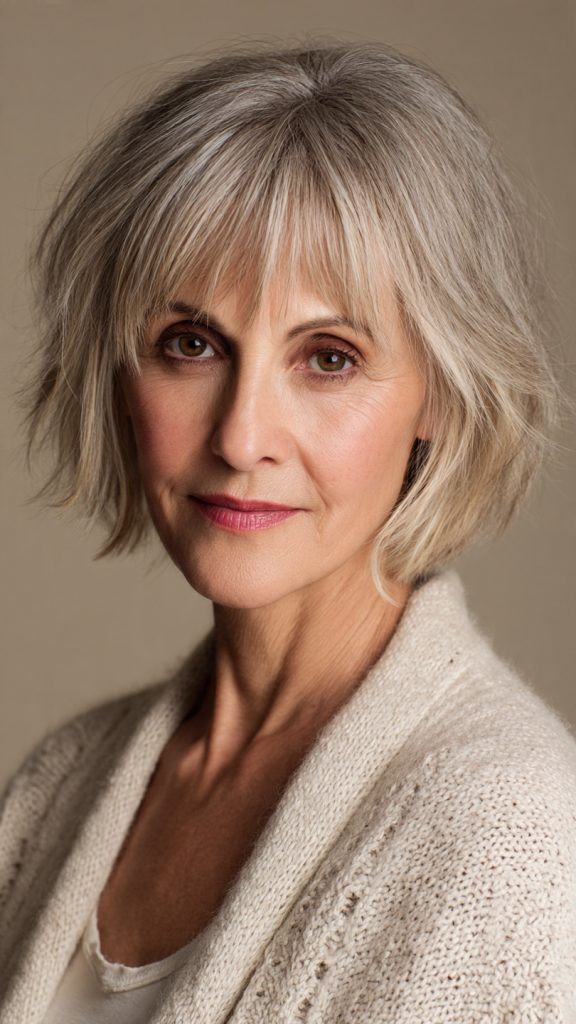 Why it works: The point-cut ends prevent the harsh “helmet” look that some blunt bobs can create on very straight hair. The soft texture also hides unevenness in gray regrowth and makes the cut look intentionally undone. This is an excellent choice for women with fine hair because the wispy ends reflect light and create visual density.
