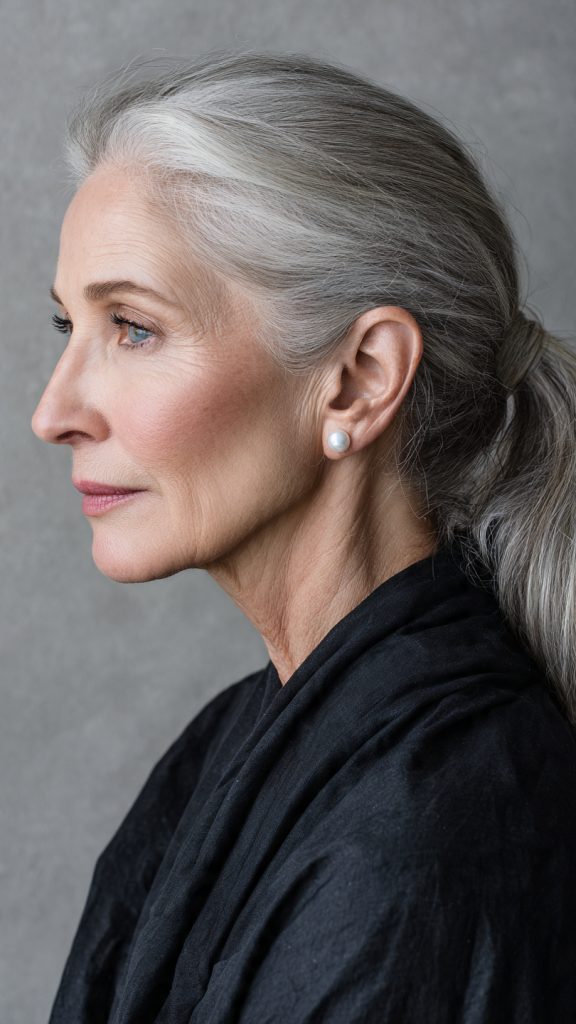 Why it works: Many older women wear their hair up or back for convenience. This cut is specifically designed to accommodate that. The face-framing layers prevent the “severe pulled-back” look that can be harsh on mature faces. The shoulder length ensures that the ponytail is not too heavy or saggy.