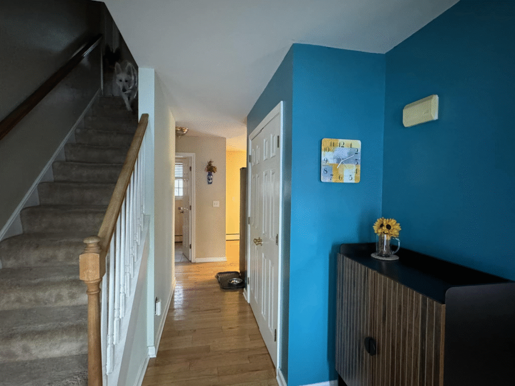 This hallway embraces bold blue walls to create a striking and energetic entryway that immediately captures attention. The saturated shade adds depth to the narrow space, making it feel intentional and stylish rather than confined. Paired with crisp white trim and architectural details on the upper staircase, the color becomes even more dramatic, highlighting the home’s character and craftsmanship.
