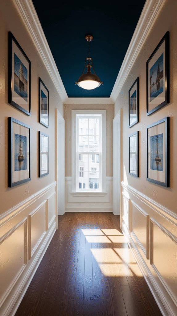 This hallway shows how a bold blue ceiling can completely transform a narrow transitional space. Instead of overwhelming the walls, the color draws the eye upward, creating height and adding architectural drama. The deep navy tone acts almost like a visual canopy, giving the hallway a tailored, custom-designed feel without requiring heavy décor.