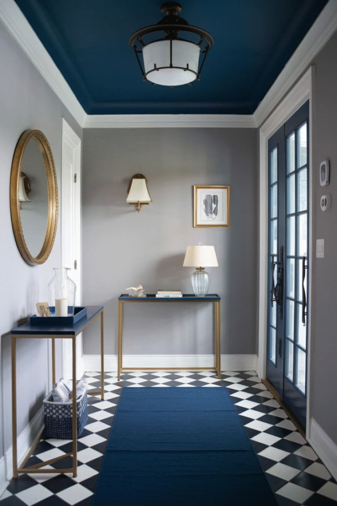 This hallway uses a deep moody blue ceiling to instantly elevate an otherwise compact space, proving that color placed overhead can be just as transformative as an accent wall. The rich blue tone creates a dramatic canopy effect, adding depth and a luxurious atmosphere the moment you step through the door. Paired with crisp white crown molding, the ceiling becomes a sharp architectural feature that feels intentional and polished.