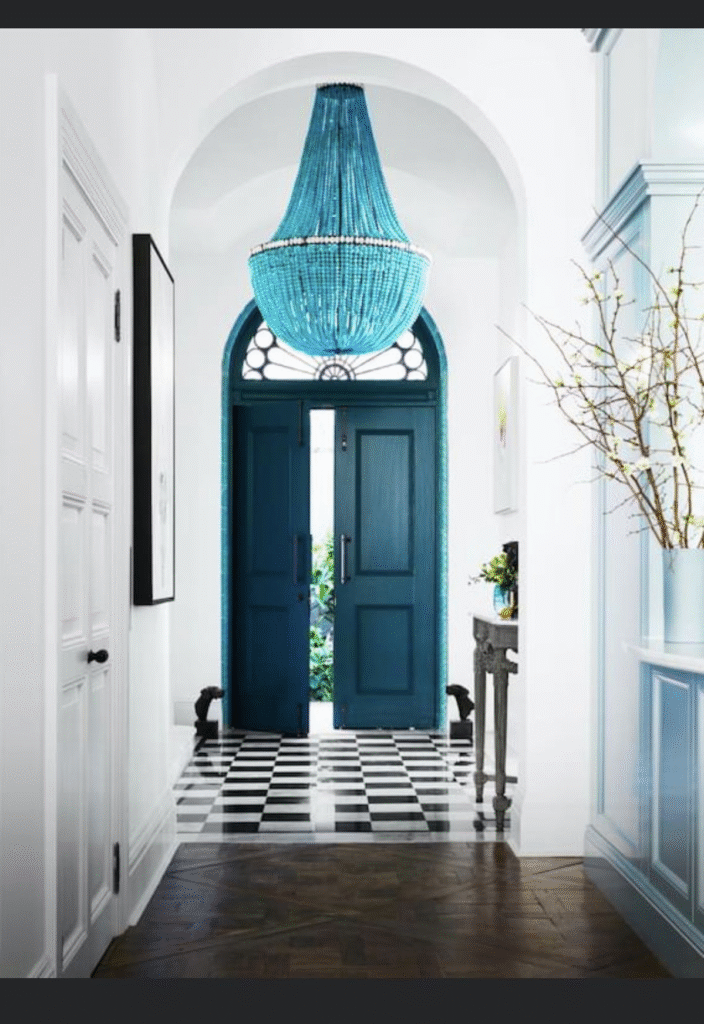 Above, the oversized turquoise beaded chandelier becomes the defining feature of the hallway. Its sculptural form and vibrant color add a dose of drama, transforming what could have been a simple passageway into a design moment worth pausing for. The interplay between the chandelier’s aqua tones and the darker blue doors creates depth and visual harmony without feeling overly coordinated.