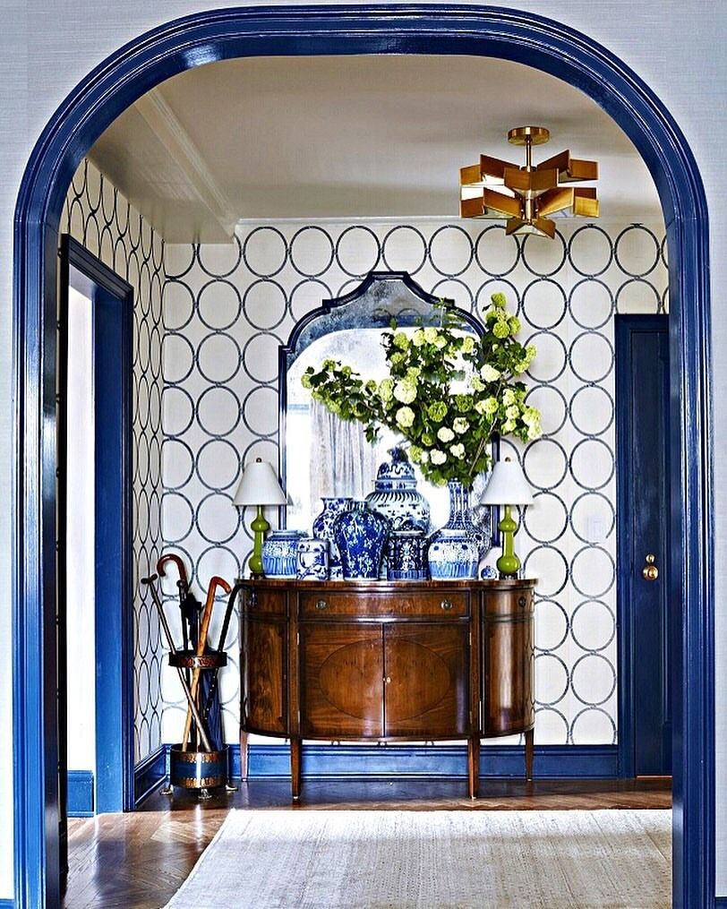 Bold Blue Trim and Pattern Play for a Striking Hallway Accent