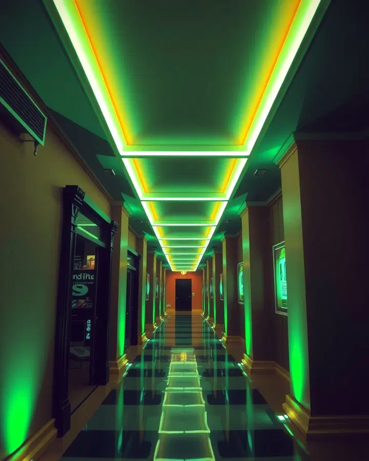 Green uplighting positioned along the columns adds another layer of ambience, casting moody glows on the walls and elevating the architectural details. The combination of glossy surfaces, symmetry, and electrified lighting results in a hallway that feels cinematic—almost like walking into a sci-fi movie scene or a high-end entertainment venue.