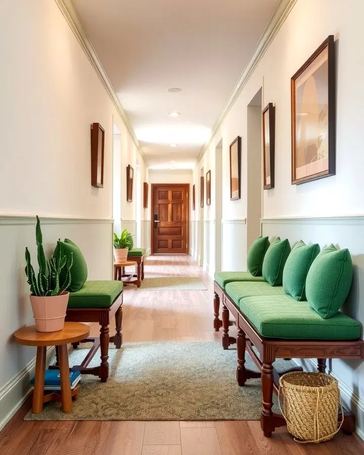 Matching benches upholstered in rich green cushions introduce a bold yet cohesive pop of color. Their classic wooden frames echo the warm wood of the front door and floors, tying the entire look together. Strategic decor pieces—like the potted cactus, woven basket, and framed artwork—add personality without cluttering the long corridor.