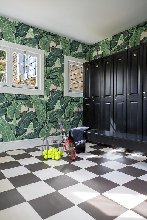 This mudroom turns a simple landing space into a vibrant, personality-filled entryway with its dramatic tropical leaf wallpaper. The oversized banana-leaf print instantly sets a fresh, energetic tone, making the room feel lively and nature-inspired. Sleek black built-in lockers add contrast and practicality, giving each family member a designated spot for storage while grounding the bold walls. The black-and-white checkered flooring adds a classic touch that balances the playful greenery, creating a space that feels both stylish and functional. A wire basket of tennis balls and a racket give the room a sporty, active vibe — perfect for families on the go.