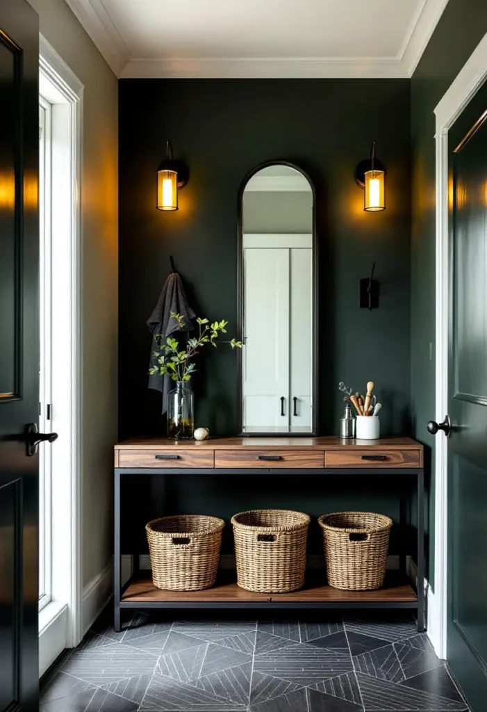 This mudroom leans into a rich, moody green palette that instantly makes the space feel grounded and sophisticated. A sleek console table with warm wood tones and black metal framing introduces a modern rustic vibe, while three woven baskets below offer practical, grab-and-go storage for shoes, scarves, or pet accessories. The tall arched mirror helps visually open the space, reflecting light and creating depth. On either side, warm amber sconces cast a soft, inviting glow that contrasts beautifully with the dark walls. Simple accessories — a glass vase with greenery, a tidy jar of essentials — keep the look minimal yet polished. It’s a perfect example of how a mudroom can be both functional and elevated in style.