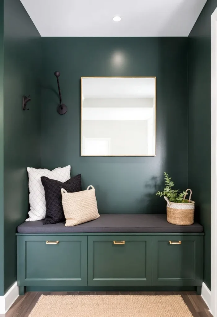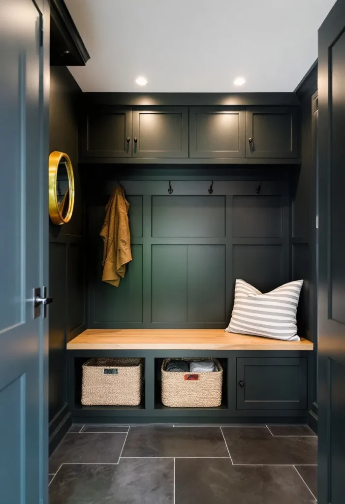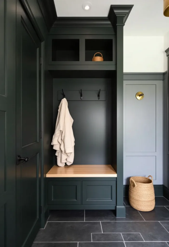 Deep Green Mudroom Nook with Built-In Storage and Warm Wood Accents