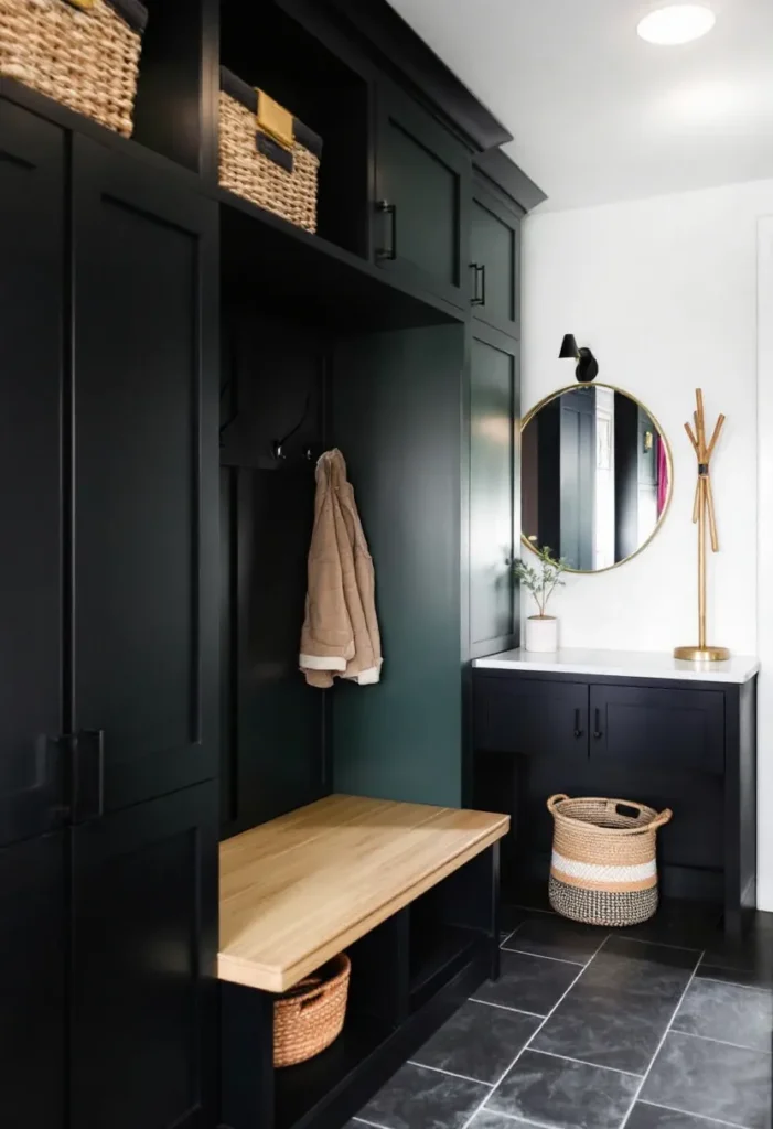 This mudroom blends deep green and matte black cabinetry to create a sophisticated, high-contrast look that still feels welcoming and practical. The built-in bench, topped with a warm butcher-block seat, provides a comfortable landing spot while woven baskets tucked underneath help corral shoes and everyday clutter. Overhead cabinets and cubbies offer generous storage for seasonal items, and the dark paint finish gives the space a polished, cohesive feel.