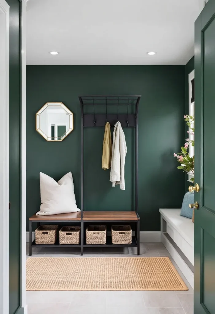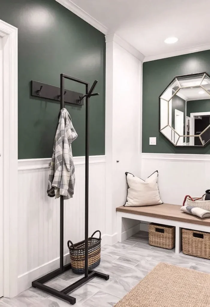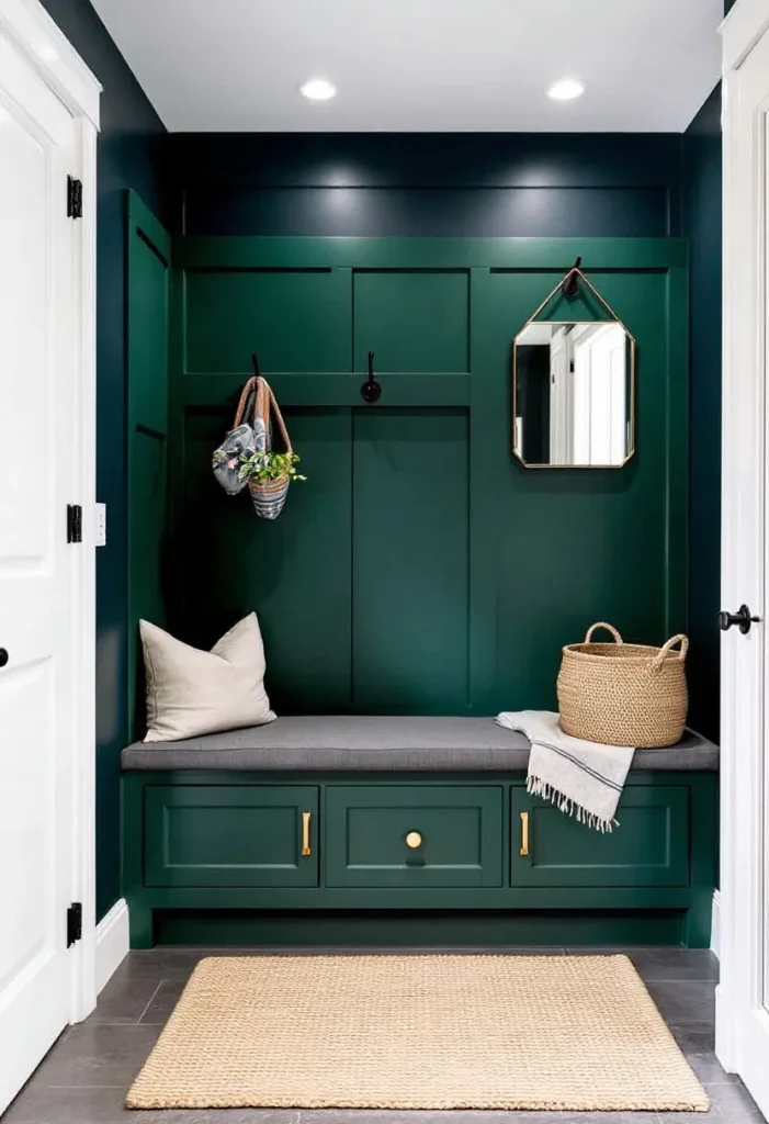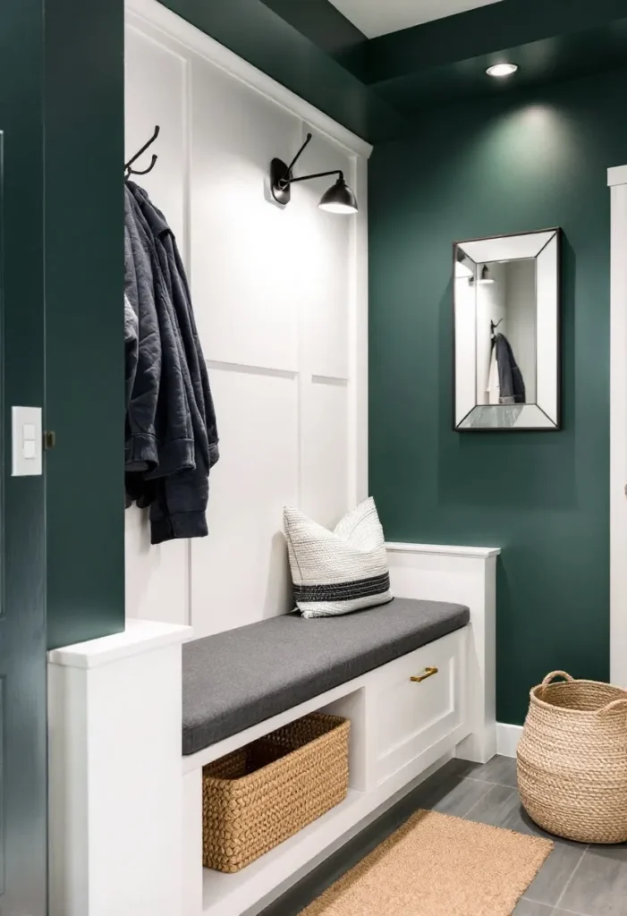 The white paneled backdrop brightens the space and prevents the deep green from feeling too heavy. A matte black sconce provides focused task lighting over the bench, making it easy to grab jackets or sit down comfortably. A small angular mirror and natural woven accents—like the floor basket and jute runner—bring in subtle organic notes. This design shows how green can be both dramatic and inviting when balanced with crisp white and warm natural textures.