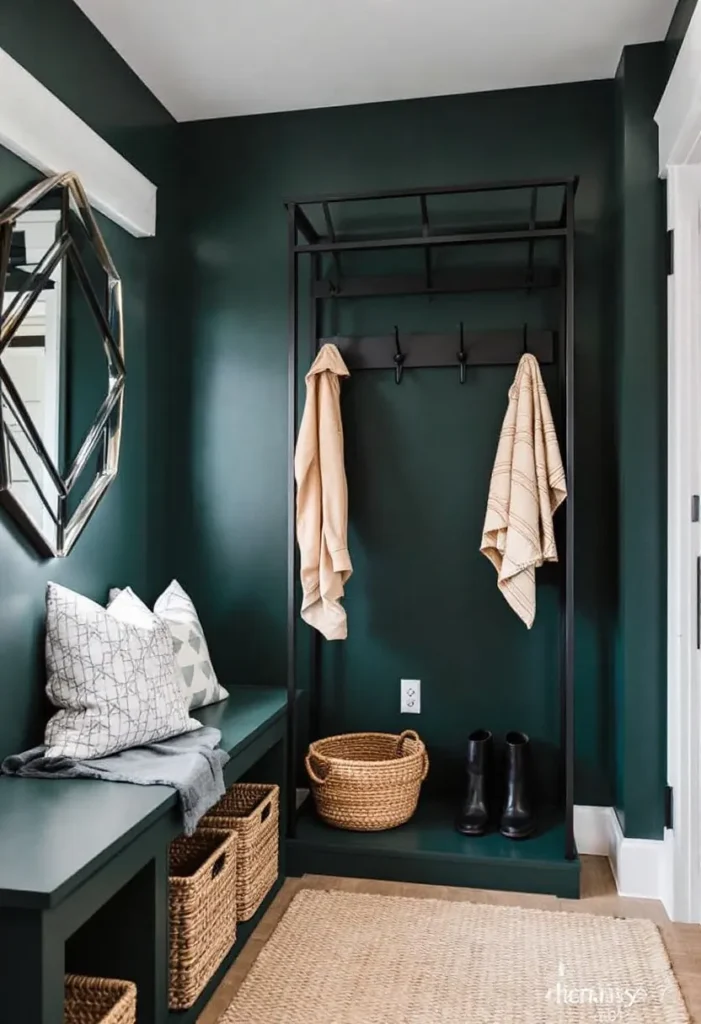 Simple black hooks on the side provide practical hanging space without detracting from the clean, elevated aesthetic. Overall, this design shows how a deeply saturated green can turn a basic entry nook into a sophisticated, functional highlight of the home.