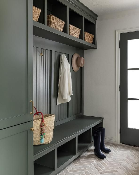 Above, a row of woven baskets tucked into open shelves maximizes vertical storage without adding visual clutter. Their natural texture warms up the cool green tones and ties in beautifully with the neutral herringbone tile underfoot. Small brass hooks hold lightweight items such as hats and jackets, keeping essentials right where you need them.