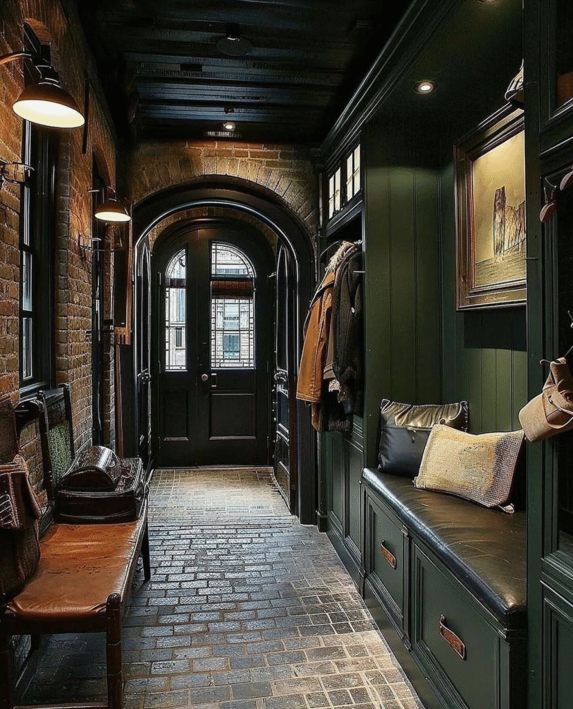 This mudroom captures the feel of a classic European corridor: dramatic, grounded, and richly layered, with deep green hues that make the entire space feel like a refined retreat.