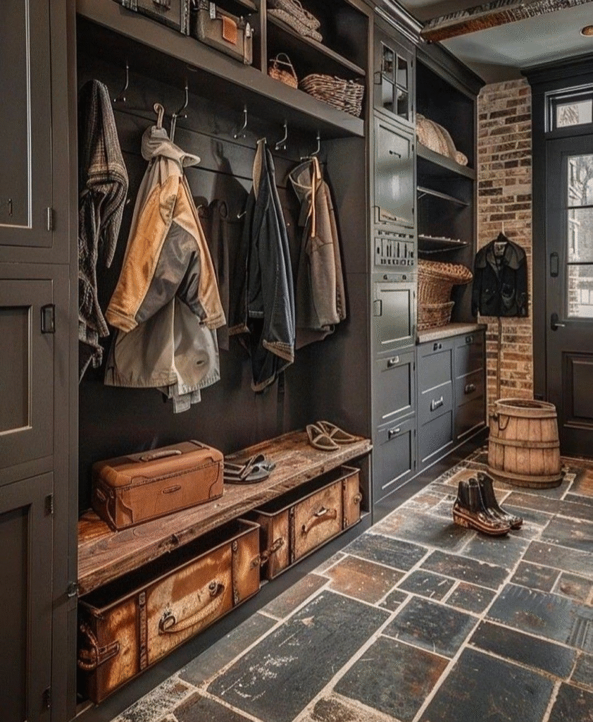 This mudroom leans fully into old-world charm, pairing deep green cabinetry with rugged, timeworn textures that instantly create a warm, lived-in feel. The built-in storage system stretches across the wall, featuring open cubbies, hooks, and drawers that offer organized, accessible spots for coats, hats, and daily essentials. Above, woven baskets add natural texture while keeping clutter neatly tucked away.