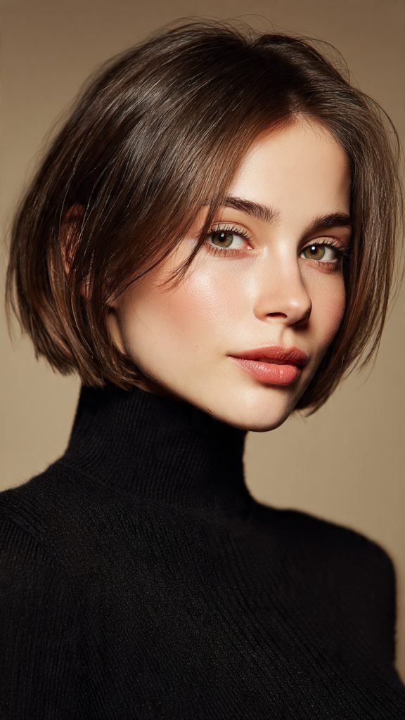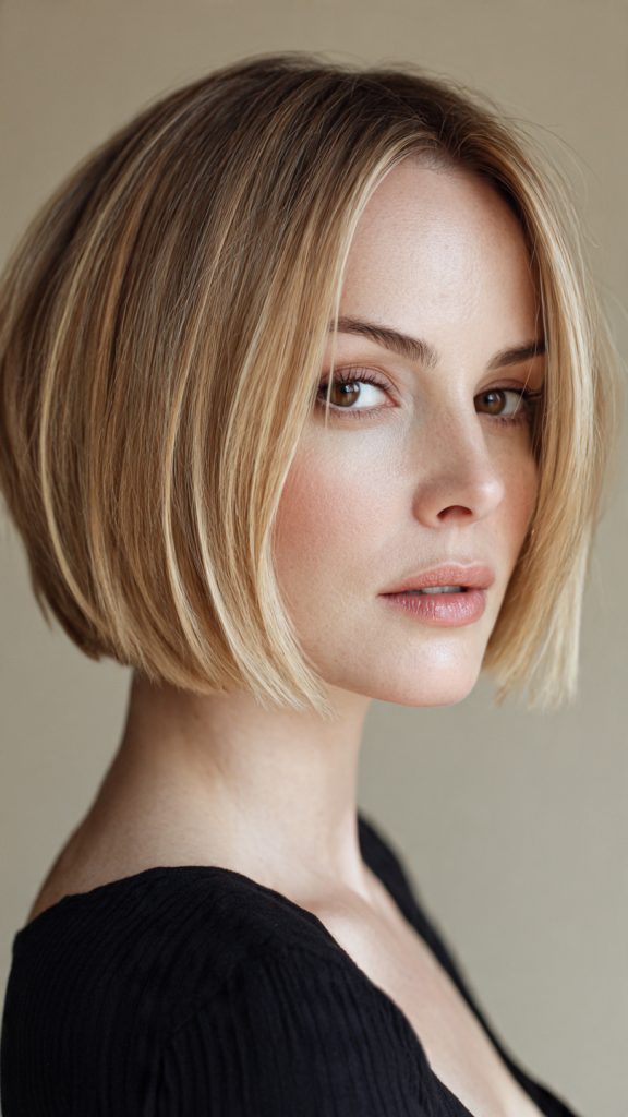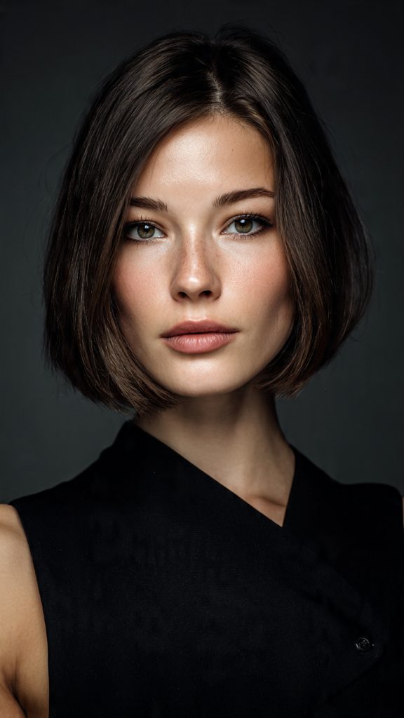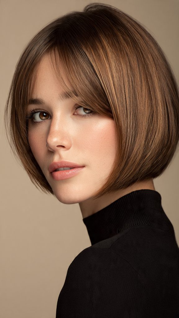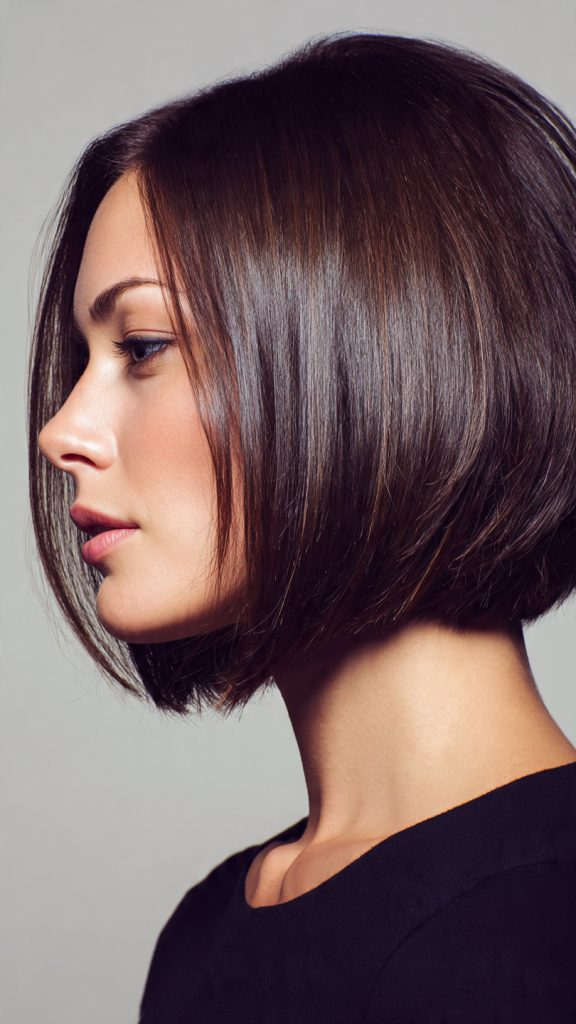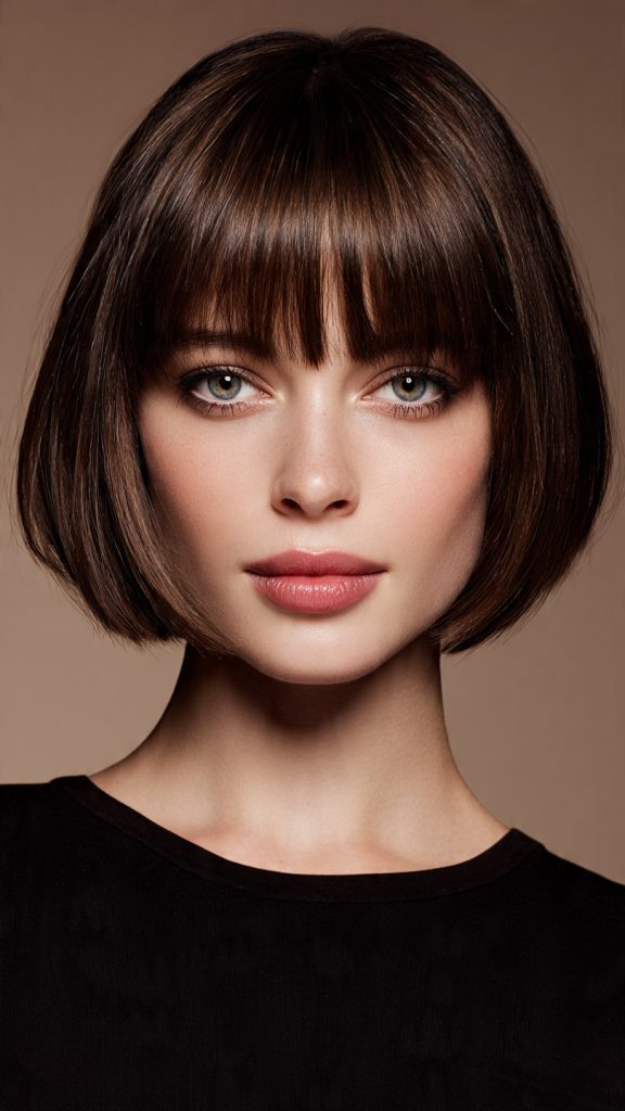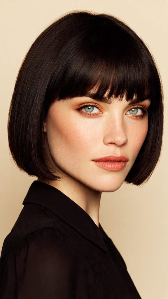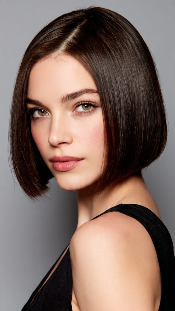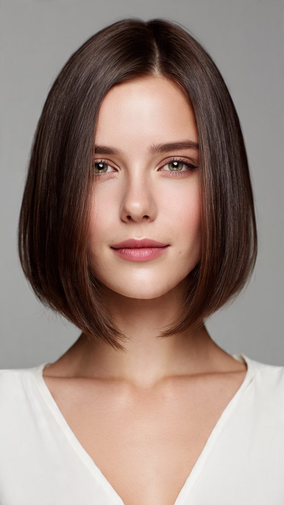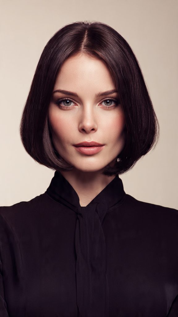 Sometimes simplicity wins. The sleek straight bob is cut to your chin or collarbone with no layers, no texture, no waves. Just mirror-smooth, glass-like hair.