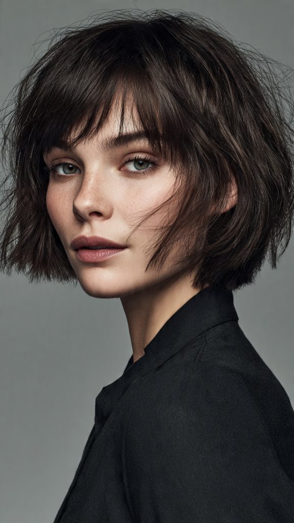 A textured bob keeps the length at your chin or below. The texture comes from point cutting — snipping vertically into the ends — which creates soft separation.