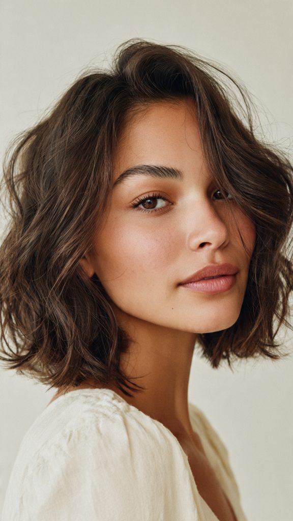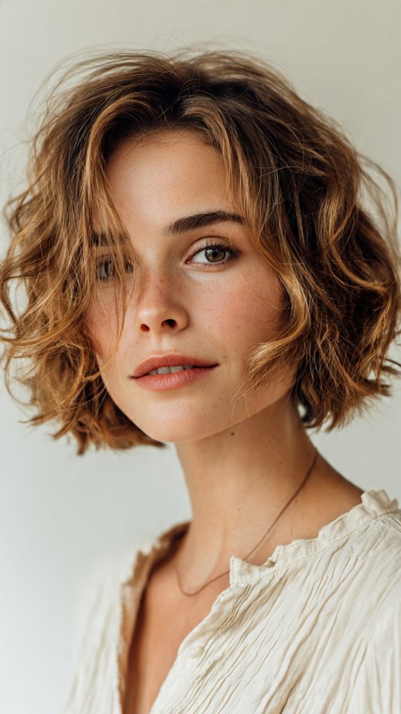 If you have natural waves, a wavy bob is a solid choice. The waves add texture and movement, which breaks up the smooth curve of a round face.