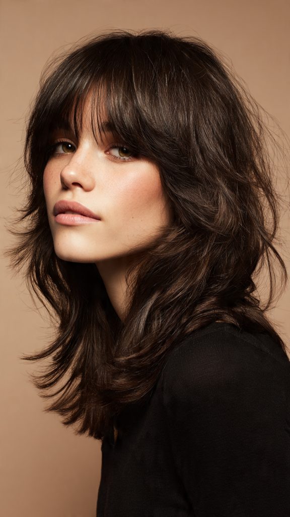 The shoulder-length shag works for round faces because the layers add vertical movement. The fringe adds a horizontal line across your forehead, which breaks up the roundness.