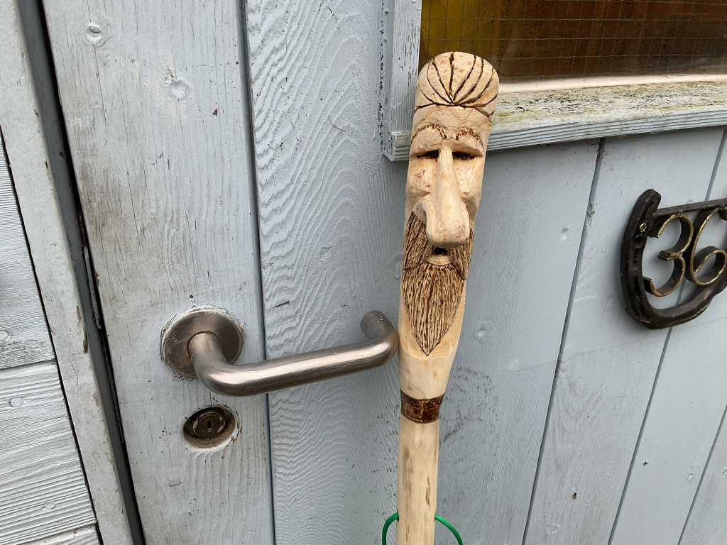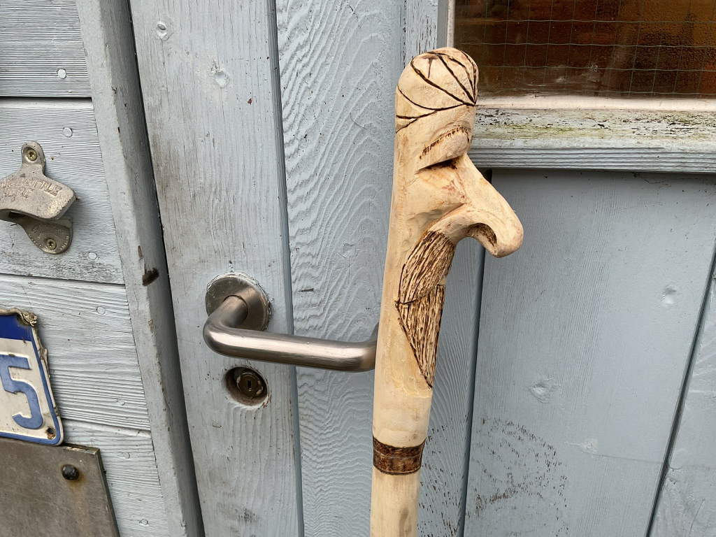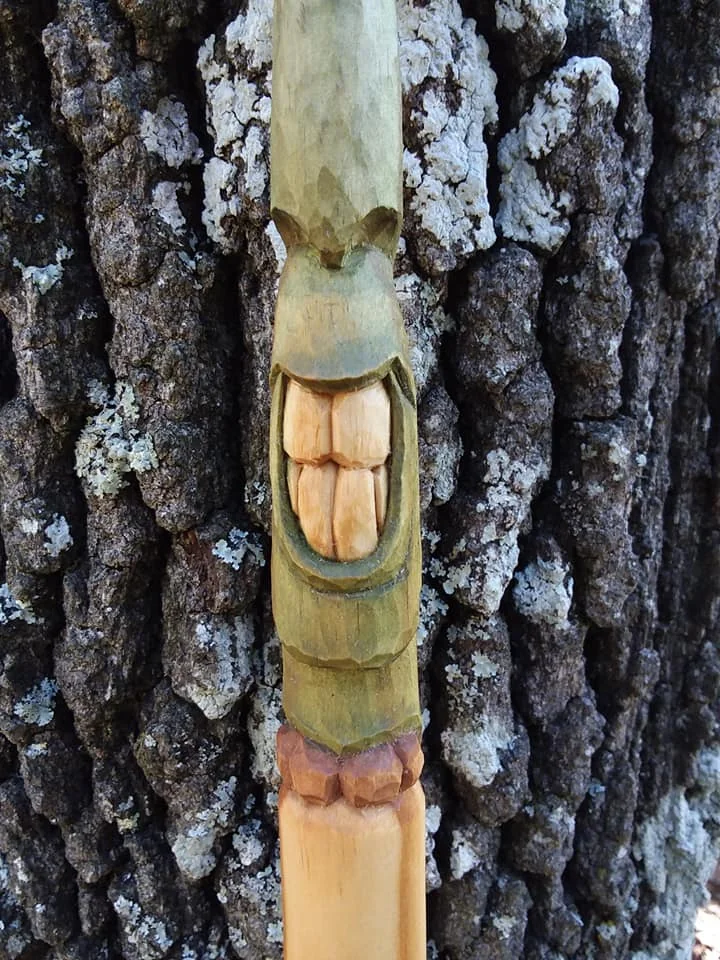 The Wise Man motif — sometimes called the Green Man variation — is among the oldest and most resonant traditions in stick carving. It capitalises on the natural curvature and grain of the wood to produce deeply spiritual characters that seem not so much carved as revealed, as if the face were always there, waiting inside the wood.