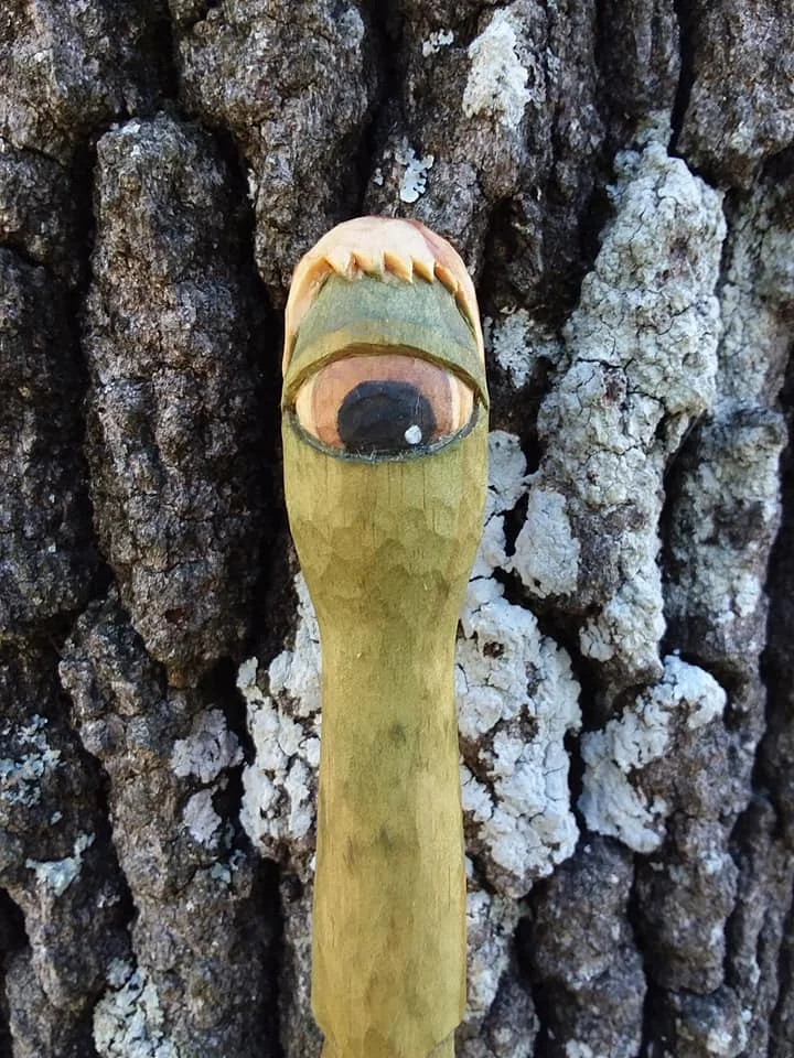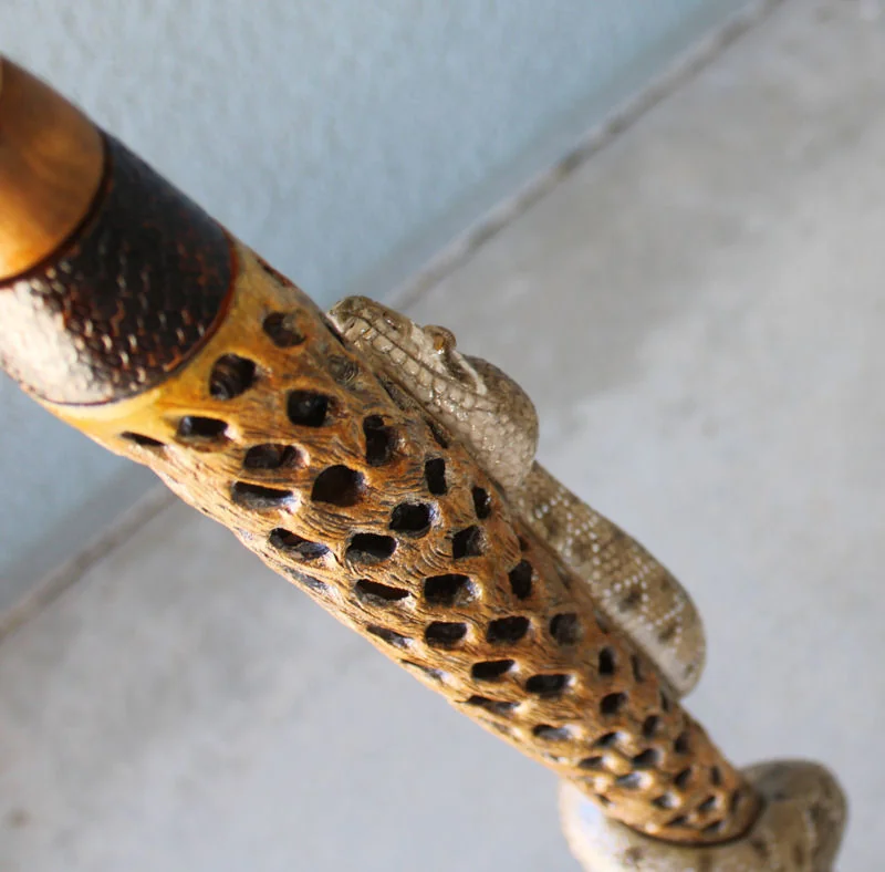 Carving a coiling serpent around the shaft of a walking stick introduces genuine drama — a sense that the stick is alive, that something primal has chosen to travel with you. Unlike a handle carving, which concentrates the eye at one end, the wrapped-animal technique distributes interest along the entire length, rewarding the viewer who takes time to turn the staff slowly in their hands.