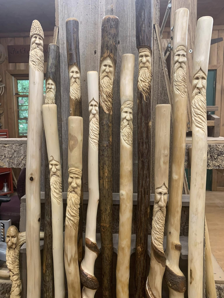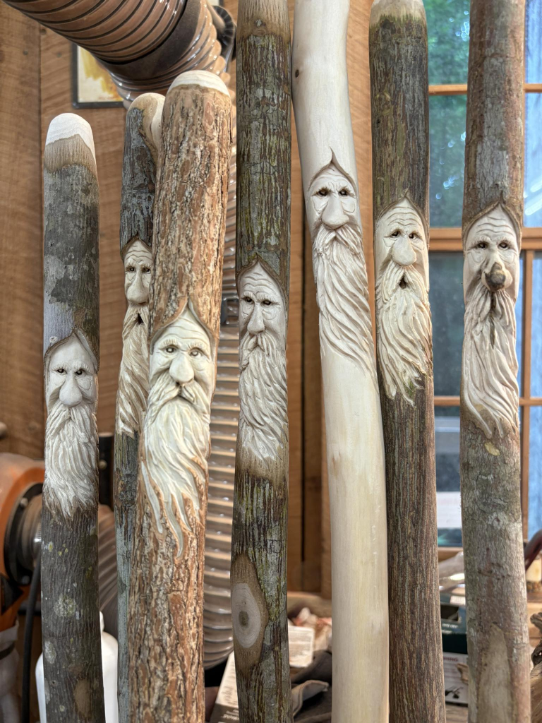What this workshop photograph truly illustrates is the impact of a single material decision: how much bark to leave on the stick. Every face here carries a long flowing beard, but the sticks divide clearly into two camps. Some have been fully peeled, their pale, smooth, cream-coloured wood exposed from top to bottom — the faces on these blanks appear bright and clean, the carved detail crisp and high-contrast against the light surface. Others retain patches or full sections of their original dark bark, which wraps around the shaft like a natural cloak, making the carved face appear to emerge from something older and more weathered.