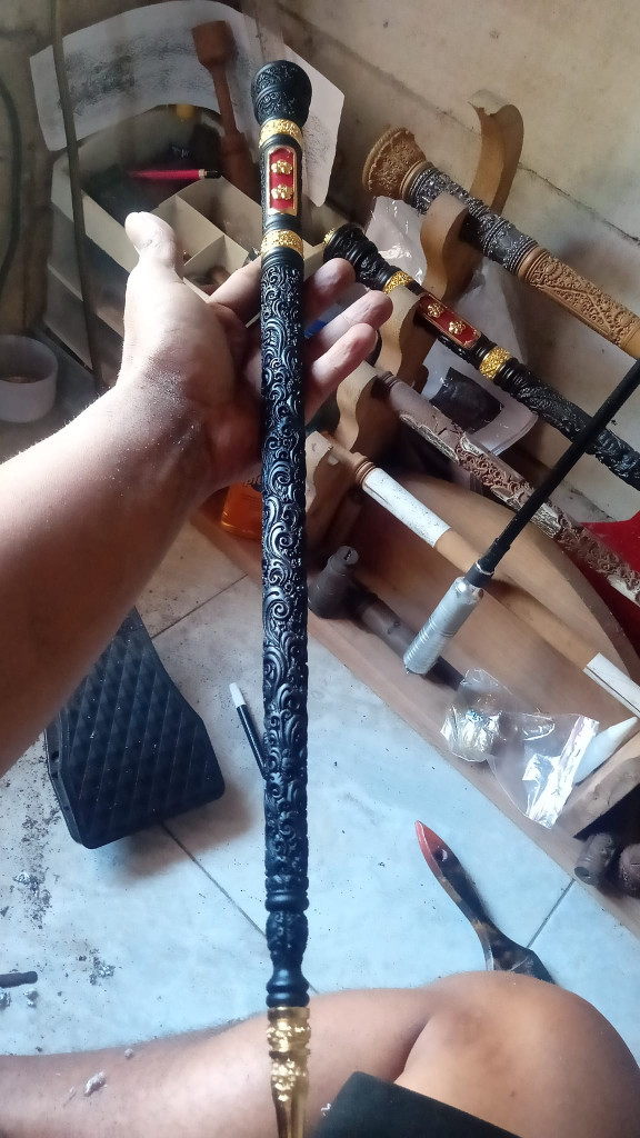 For a truly ceremonial or highly decorative stick, the carving can extend the entire length of the shaft, utilizing complex, high-density filigree patterns, often inspired by traditional Indonesian, Malaysian, or tribal designs . This approach relies on meticulous, repetitive carving—typically a low-relief vine or swirling floral motif—that provides constant tactile interest along the grip. Furthermore, this style integrates mixed media, using materials like brass or gold-toned metal bands to segment the carving and add luxurious contrast, while the application of a dark stain or black paint makes the fine filigree details stand out dramatically against the metallic highlights.