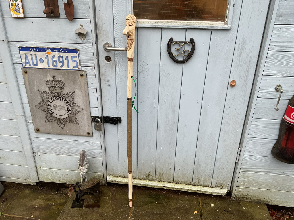 The full-length photograph, taken against a weathered blue door beside an Australian police constabulary badge and a Western Australia number plate, shows the stick in its full context — a slim, pale shaft of consistent diameter, the carved head sitting neatly at the handle crook, the whole piece elegant and understated in proportion.