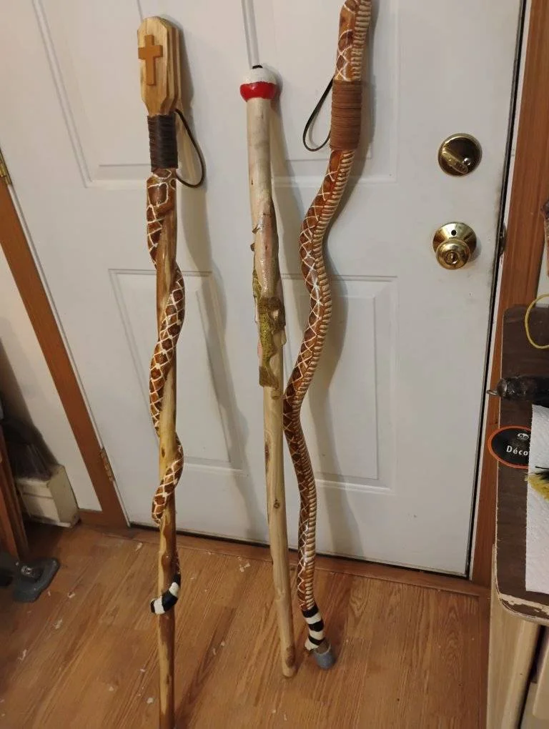 This photograph places three very different walking sticks side by side, and the comparison is instructive. All three feature animal-wrap decoration running the length of the shaft, but the interpretation of that idea differs significantly from one to the next.