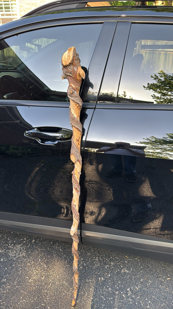 Photographed against the glossy black door of a vehicle, the warm tones of the bark glow with particular intensity, and the full length of the spiral twist is visible from tip to handle in a single glance. It is a stick that asks the question every natural-material carver eventually faces: at what point does intervention improve on what is already there — and when is the wisest cut no cut at all.