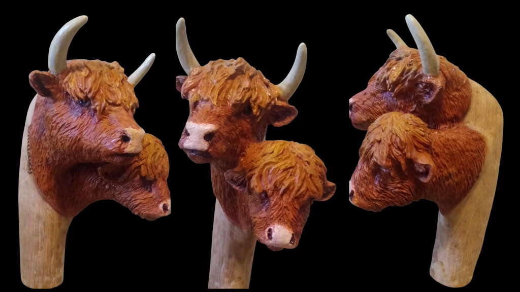 The first pair of images sets the register immediately. A rattlesnake-wrap crook handle — the serpent’s patterned body forming the arc of the grip, its head resting where the thumb naturally falls — demonstrates how the animal-wrap idea translates from shaft to handle without losing any of its tension. Beside it, two Highland cattle heads on bare pale blanks show a very different ambition: the complete sculptural rendering of a specific breed, complete with swept horns, shaggy forelocks, and individually modelled facial features. The contrast between the two — organic and functional versus formal and representational — captures the breadth of the handle-carving tradition in a single page.