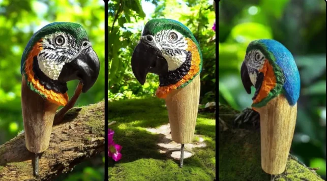 The second row opens with two vivid macaw parrot heads, painted in full colour with carefully observed eye detail, mounted on what appear to be antler or bone-pale wood bases. The dramatic green, orange, and black plumage is rendered not just in paint but in the underlying carving, which captures the curve of the beak and the slight backward tilt of the skull that gives parrots their alert, questioning expression. The central image shows an elephant emerging from the top of a dark, bark-on shaft — head, trunk, and ear all carved in the round, the rough bark of the shaft forming a natural savannah-coloured base. The eagle head beside it, painted in naturalistic brown and white with a vivid yellow beak and glass-set eye, is perhaps the most polished piece in the collection: the feather layering on the crown is carved in low relief and then painted individually, producing a depth that paint alone could not achieve.